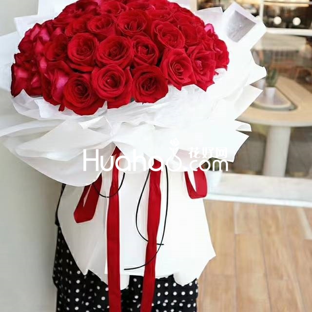 红玫瑰99朵,99枝精品红玫瑰,内衬白色雪梨纸外围白色雾面纸.